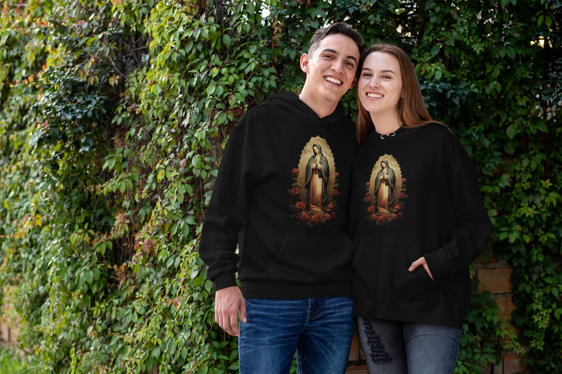 No es solo ropa, es respeto. Este hoodie negro de corte unisex lleva impreso a la Virgen de Guadalupe en el pecho, rodeada de rosas rojas y fuerza espiritual. Perfecto para los que caminan con fe, pero con estilo firme.